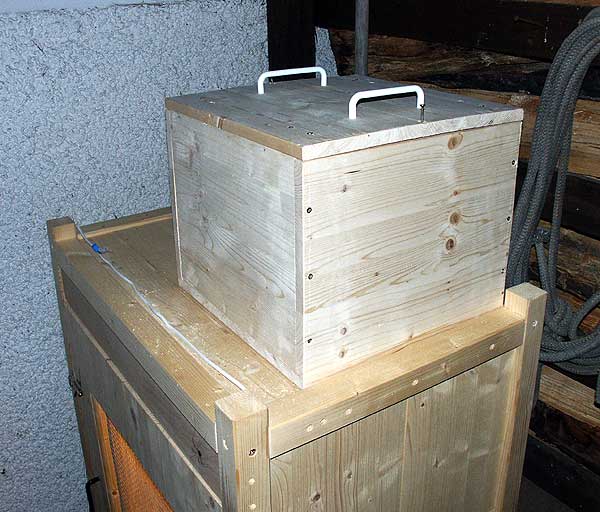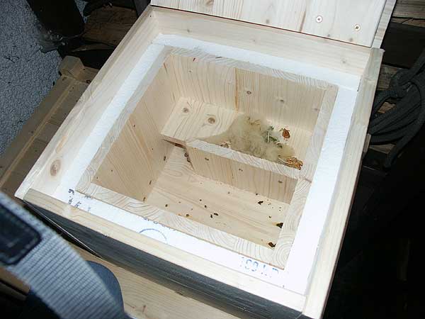 eine Heizung (bzw. Frostschutz) eingebaut. Als "Inneneinrichtung" der Box habe ich Schafwolle zur Verfügung gestellt, die er auch gerne genommen hat.